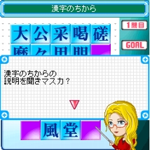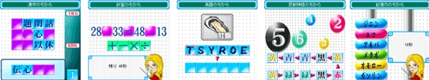 ☆トレーニングは全部で5種類 ●「漢字のちから」 画面上にある漢字を組み合わせ、四文字熟語を作成します。 問題は全部で3つあり、1問目は12文字、2問目は16文字、3問目は20文字です。 問題開始時はランダムに2文字選定されているので、まずはその2文字を使った四文字熟語から作成していきます。 ●「計算のちから」 上のマスでバラバラに表示されたアルファベットを正しく並べ替え1つの単語にします。絵または言葉がヒントとなっています。問題は間違えた時点で終了、パーフェクトは10問完答です。 ●「英語のちから」 画面上にある漢字を組み合わせ、四文字熟語を作成します。 問題は全部で3つあり、1問目は12文字、2問目は16文字、3問目は20文字です。問題開始時はランダムに2文字選定されているので、まずはその2文字を使った四文字熟語から作成していきます。 ●「反射神経のちから」 画面上部に表示された色にそれぞれ番号が書かれています。画面下部に表示されている順に色番号を数字キーで入力していきます。間違った時点でその問題は終了し次の問題へ進みます。問題は全部で5問です。 ●「記憶力のちから」 画面左側に表示された言葉を制限時間内に覚えます。その後ランダムに表示されますので、覚えた順番に右側に並べていきます。問題は全部で3問、制限時間は徐々短くなっていきます。 |