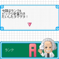 ☆成績(ランク)と履歴 「ちから試し」はランダムに選ばれた3種類全てのゲームが終了した時、「練習のちから」はそれぞれゲームが終わった時に成績画面が表示されます。成績はランクS、A、B、C、Dの5段階あります。ランクSは各ゲーム、パーフェクトまたは解答数が非常に多くなければ達成することができない最上級ランクです。また「ちから試し」「練習のちから」はそれぞれ成績が履歴となって残るため、苦手なジャンルがどれなのか知ることができます。 |