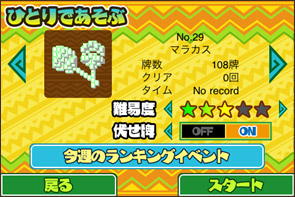 配列は全部で30あり、各配列でゲームの難易度が5段階で設定できます。(「上海」は3段階)。また、伏せ牌(隠し牌)のON/OFFが選択できます。「アンドゥ」や「ヒント」、牌に目印をつけることができる